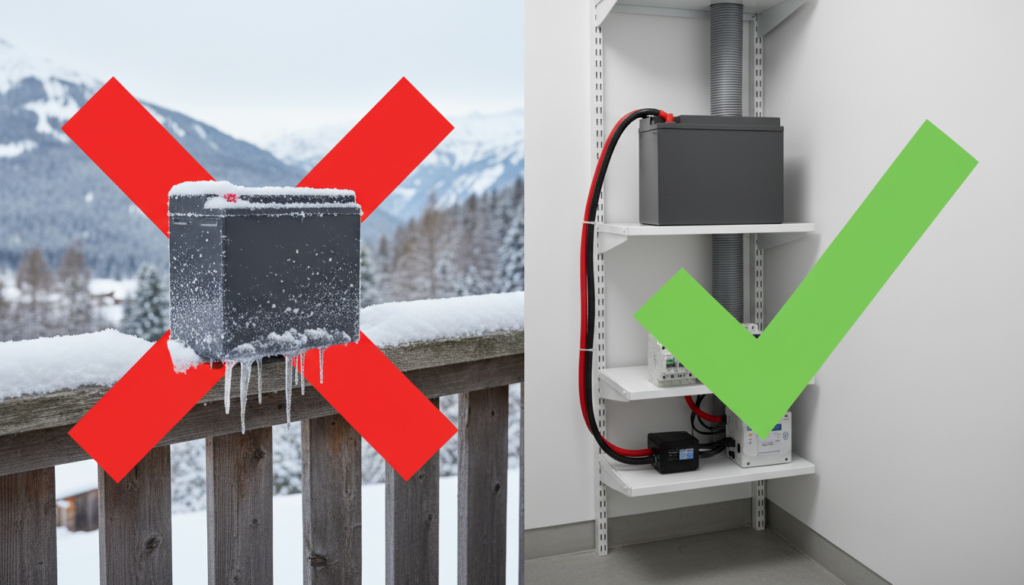 A split-screen comparison image. Left side: A frost-covered generic battery unit on a snowy balcony with a red ‚X‘ overlay. Right side: The same battery unit installed neatly inside a modern utility room on a shelf, connected with thick cables passing through a wall conduit, showing a green checkmark. High contrast, realistic tech photography style.